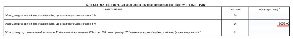 Переходимо до 4 розділу «ІV. ПОКАЗНИКИ ГОСПОДАРСЬКОЇ ДІЯЛЬНОСТІ ДЛЯ ПЛАТНИКІВ ЄДИНОГО ПОДАТКУ ТРЕТЬОЇ ГРУПИ». У 6 рядку «Обсяг доходу за звітний (податковий) період, що оподатковується за ставкою 5 %» необхідно написати дохід за рік. Тобто не дохід за IV квартал, а суму доходу за I, II, III та IV квартали.Примітка. ФОП 3 групи заповнюють декларації зростаючим підсумком - перший квартал, півріччя, три квартали та рік.