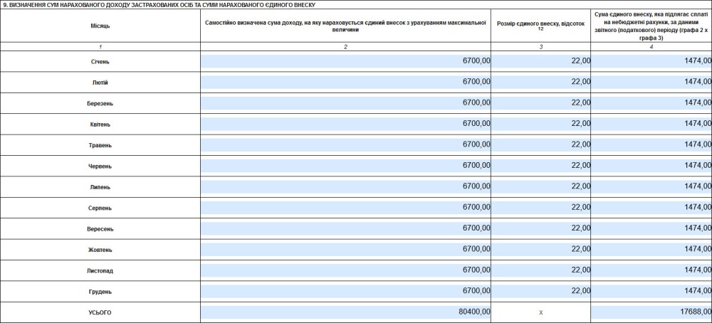 Далі переходимо до заповнення таблиці «9. ВИЗНАЧЕННЯ СУМ НАРАХОВАНОГО ДОХОДУ ЗАСТРАХОВАНИХ ОСІБ ТА СУМИ НАРАХОВАНОГО ЄДИНОГО ВНЕСКУ».