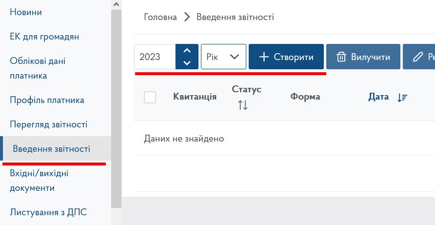 В кабінеті платника заходимо у меню «Введення звітності» і обираємо 2023 рік, період подання — «Рік» та натискаємо «Створити»: