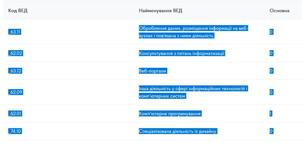 Для того, щоб вставити всі КВЕДи, у новій вкладці браузера відкриваємо сторінку «Облікові дані платника» Електронного кабінету і в самому низу є список всіх КВЕДів. Основний позначений цифрою 1. Виділяємо та копіюємо список (Ctrl + C):