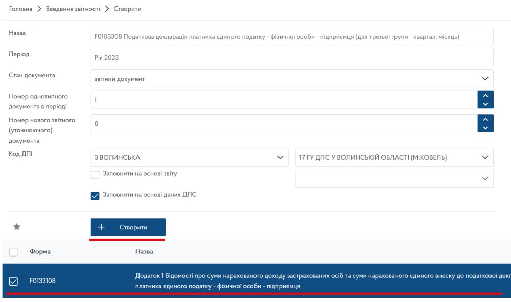 У наступному вікні перевіряємо правильність автоматично згенерованих даних, зокрема найменування вашої податкової (інколи підтягуються неправильні дані). Оскільки ми подаємо річну декларацію, обов’язково помічаємо поле «Додаток 1 Вiдомостi про суми нарахованого доходу застрахованих осiб та суми нарахованого єдиного внеску до податкової декларацiї платника єдиного податку - фiзичної особи - пiдприємця» (Форма F0133108) і натискаємо «Створити»: