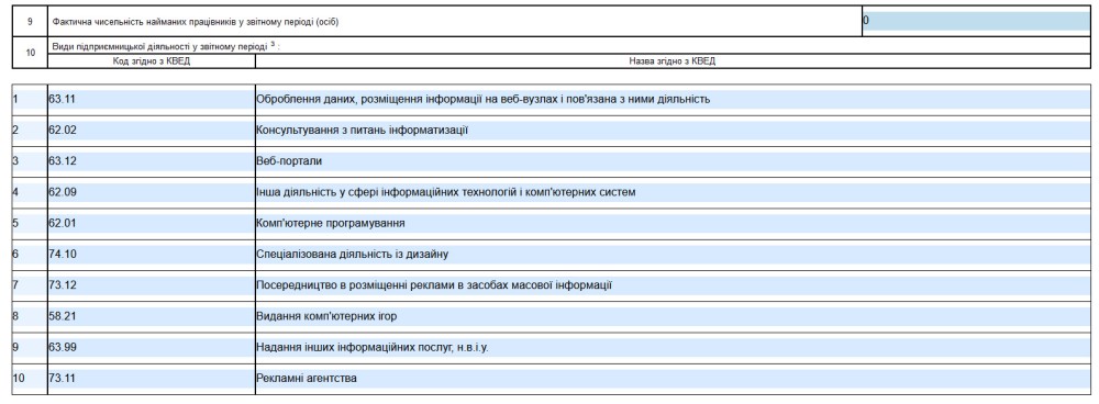 У наступному вікні також перевіряємо автоматично згенеровану інформацію у таблиці та переходимо до 9 рядка «Фактична чисельність найманих працівників у звітному періоді (осіб)». Якщо працівників немає — ставимо 0. ФОП сам для себе не є працівником. Далі заповнюємо коди згідно з КВЕД. Необхідно вказати всі КВЕДи згідно з якими ви отримували прибуток у IV кварталі 2023 року. Проте, не буде помилкою, якщо ви вкажете всі КВЕДи, які у вас є в реєстрі платника єдиного податку.