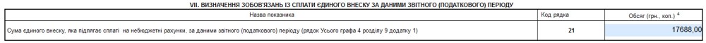 У результаті, загальна сума за весь рік по ЄСВ становитиме 17688.00 грн, яка буде автоматично вписана у 21 рядок «Сума єдиного внеску, яка підлягає сплаті на небюджетні рахунки, за даними звітного (податкового) періоду (рядок Усього графа 4 розділу 9 додатку 1)» декларації.