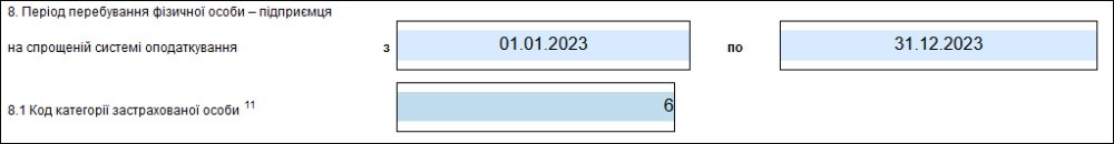 У полі 8.1 вказуємо «Код категорії застрахованої особи». Оскільки у нас спрощена система оподаткування — ставимо 6.