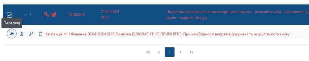 Якщо через деякий час колір тексту відправленої декларації став червоним, це означає, що потрібно виправити помилки та повторити спробу. Щоб дізнатися, які помилки ми зробили, вибираємо нашу декларацію, натискаємо «Квитанція» та «Перегляд»: