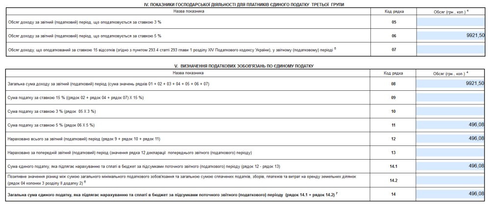 Якщо ж дохід був, переходимо до 4 розділу «ІV. ПОКАЗНИКИ ГОСПОДАРСЬКОЇ ДІЯЛЬНОСТІ ДЛЯ ПЛАТНИКІВ ЄДИНОГО ПОДАТКУ ТРЕТЬОЇ ГРУПИ». У 6 рядку необхідно написати дохід за 1 квартал. Якщо у вас дохід на рахунку у банку, підсумовуємо суму надходжень з 1 січня по 31 березня. Якщо доходи у валюті, то переводимо по курсу НБУ на дату надходження. Проставляємо суму, в результаті чого відбудеться авторозрахунок (інколи не працює, тому необхідно інформацію вносити самостійно). Наприклад, ФОП за 1 квартал отримав заробіток у сумі 9921,5 грн. Тому у 6 рядку вписуємо: 9921,50.
