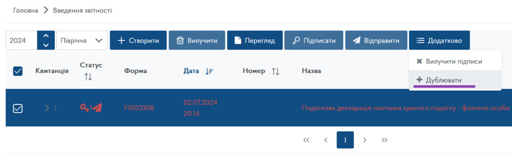 Для повторного відправлення необхідно вибрати необхідну декларацію та у верхньому меню натиснути «Додатково» та «Дублювати»: