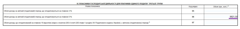 Наприклад, якщо за I квартал ви отримали 9921,50 грн, а за II ще 5331,50 гривень доходу, підсумовуємо дохід за 2 квартали та вписуємо загальну суму (15 253) у 6 рядок «Обсяг доходу за звітний (податковий) період, що оподатковується за ставкою 5 %».