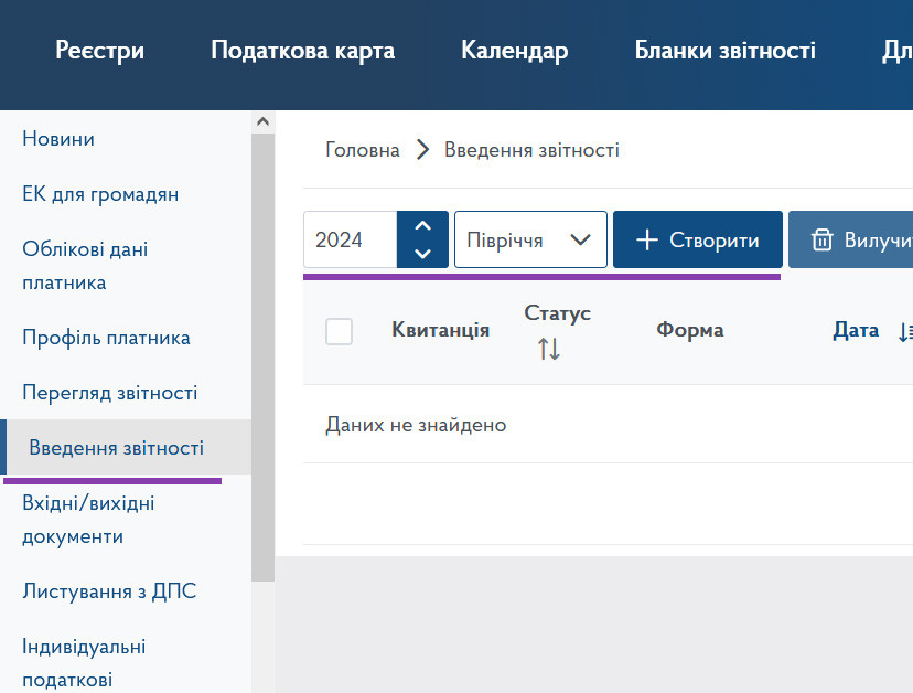 Як завжди, покрокова інструкція створюється з паралельним заповненням декларації. Подаємо звіт через Електронний кабінет платника податків. Переходимо у пункт «Введення звітності», вибираємо необхідний нам період - 2024 рік, період подання — «Півріччя» та натискаємо «Створити»: