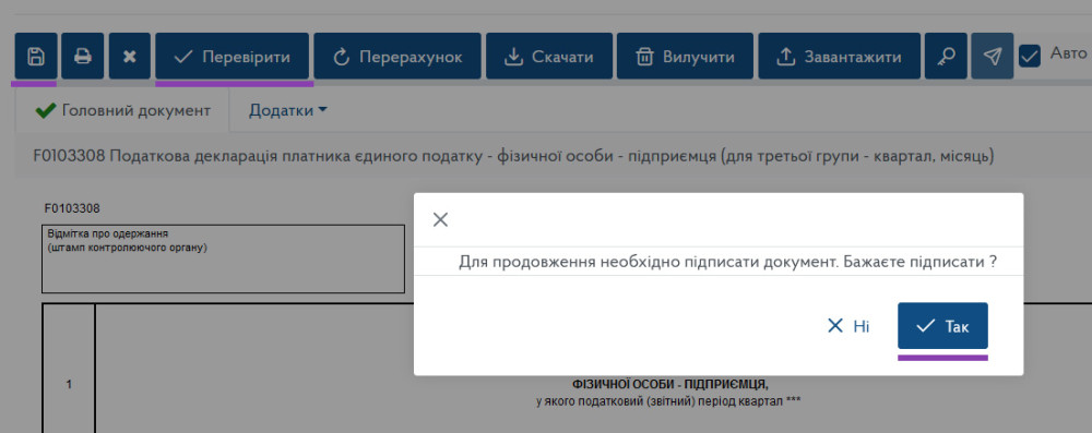 Далі у верхньому меню натискаємо «Перевірити» та «Зберегти», після чого нам запропонується відразу підписати документ:
