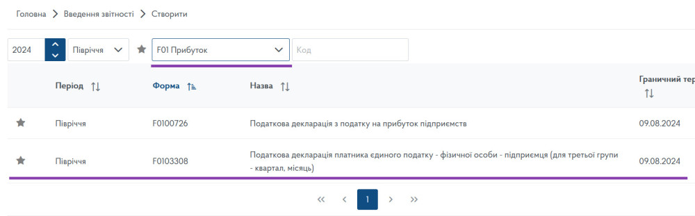 У наступному вікні вибираємо пункт «F01 Прибуток» та «F0103308 Податкова декларація платника єдиного податку - фізичної особи - підприємця (для третьої групи - квартал, місяць)»: