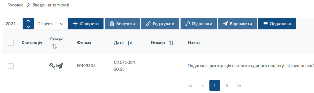Після виконаних операцій у розділі «Введення звітності» ви побачите відправлену декларацію: