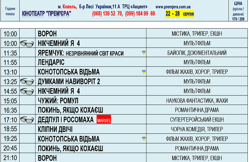 - Ознайомлюємося з новим розкладом на 29 серпня - 4 вересня 2024 та бігом в кінотеатр!