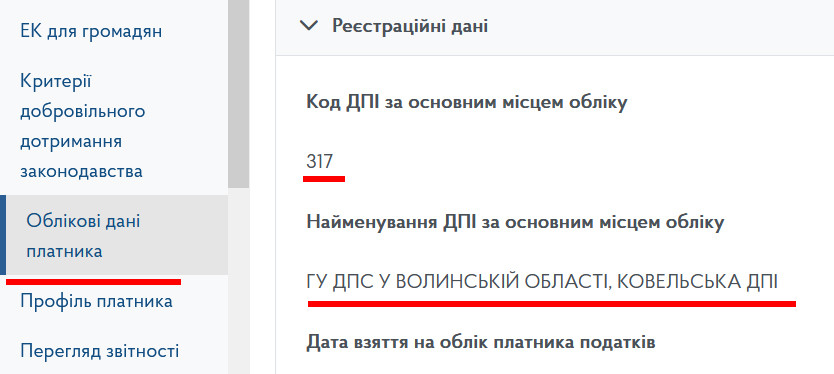 У наступному вікні перевіряємо правильність автоматично згенерованих даних, зокрема найменування вашої податкової (Код ДПІ). Для цього у новій вкладці браузера відкриваємо сторінку «Облікові дані платника» та звіряємо «Код ДПІ за основним місцем обліку»: