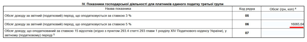 Далі переходимо до 4 розділу «ІV. Показники господарської діяльності для платників єдиного податку третьої групи». У 6 рядку «Обсяг доходу за звітний (податковий) період, що оподатковується за ставкою 5 %» необхідно написати дохід за півріччя. Тобто не дохід за II квартал, а суму доходу за I та II квартали.