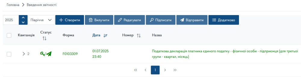 Після виконаних операцій у розділі «Введення звітності» ви побачите відправлену декларацію: