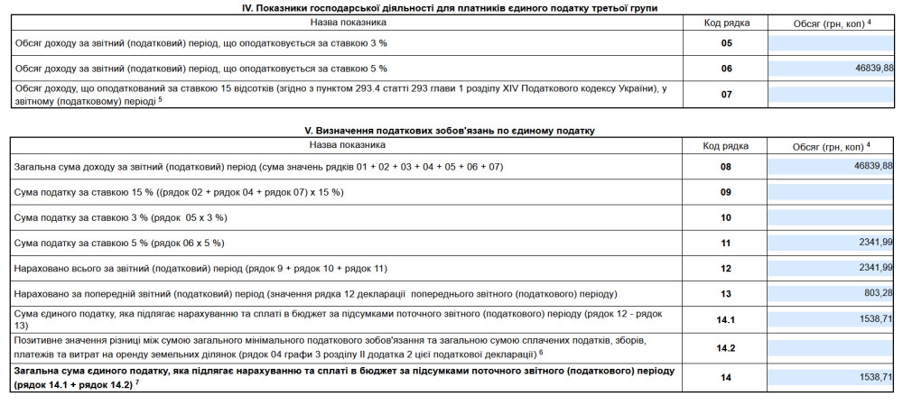 Раніше у 13 рядок «Нараховано за попередній звітний (податковий) період (значення рядка 12 декларації попереднього звітного (податкового) періоду)» розділу «V. Визначення податкових зобов'язань по єдиному податку» необхідно було вручну вписувати суму єдиного податку, яку ми вже нараховували та сплачували за попередній квартал. В декларації за 1 квартал ця сума знаходиться у 14 рядку «Загальна сума єдиного податку, яка підлягає нарахуванню та сплаті в бюджет за підсумками поточного звітного (податкового) періоду (рядок 14.1 + рядок 14.2)».