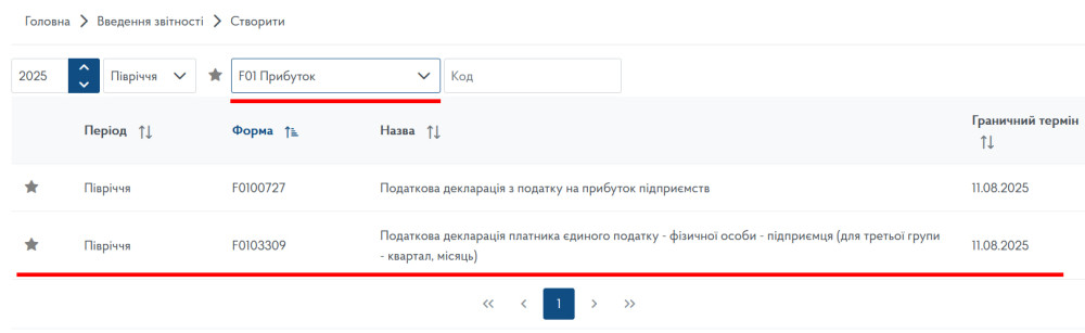 Подаємо звіт через Електронний кабінет платника податків. Переходимо у пункт «Введення звітності», вибираємо необхідний нам період - 2025 рік, період подання — «Півріччя» та натискаємо «Створити»:
