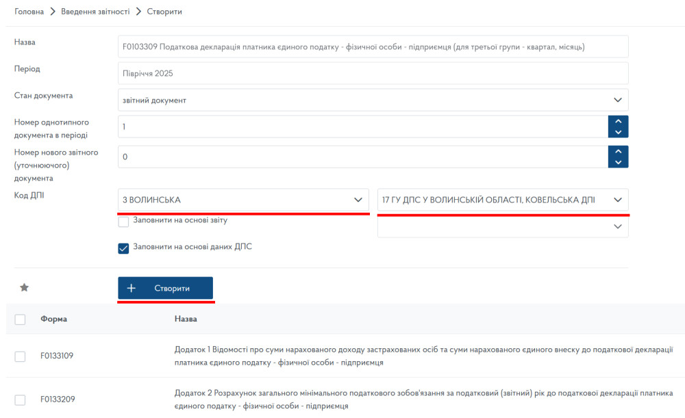 Як завжди, покрокова інструкція пишеться з паралельним заповненням декларації.Подаємо звіт через Електронний кабінет платника податків. Переходимо у пункт «Введення звітності», вибираємо необхідний нам період - 2025 рік, період подання — «Півріччя» та натискаємо «Створити»: