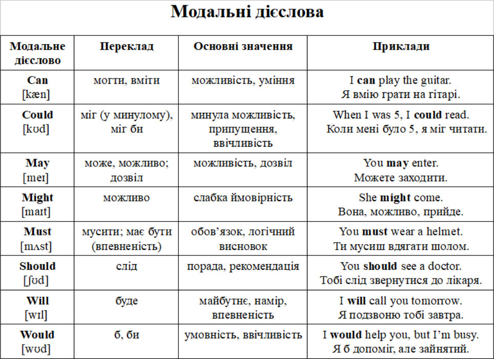 Отже: модальні дієслова потрібні, щоб виражати можливість, обов’язок, дозвіл, ймовірність, пораду тощо. Вони завжди стоять перед основним дієсловом у початковій формі.Модальні дієслова – це маленькі «помічники», які роблять ваше мовлення гнучким і живим. Вони допомагають висловити не тільки дію, але й ставлення до неї: чи це обов’язок, чи дозвіл, чи можливість. Вивчити їх – означає зробити великий крок до справжньої, «живої» англійської.
