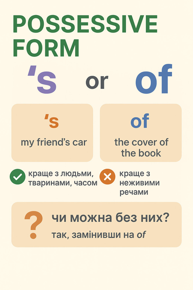 🔹 У сучасній англійській присвійна форма (‘s / s’) — дуже поширена, особливо:- коли мова про людей або живих істот: