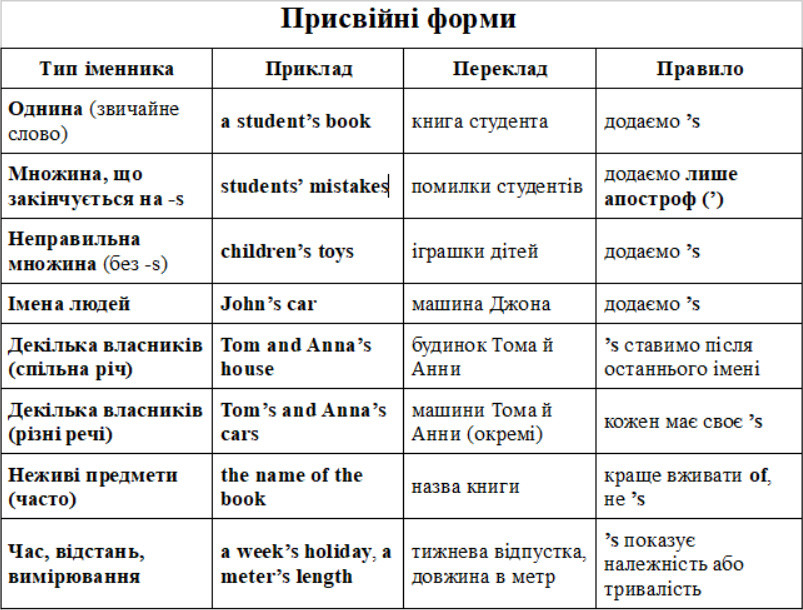 John’s car (машина Джона), my friend’s idea (ідея мого друга), the cat’s tail (хвіст кота)