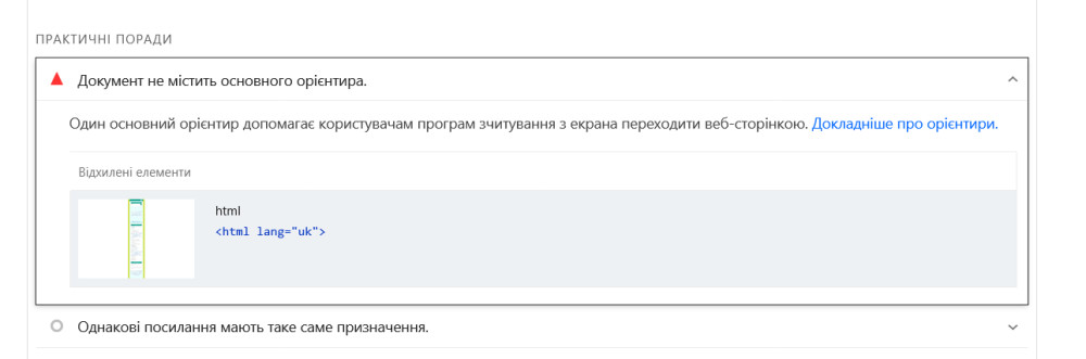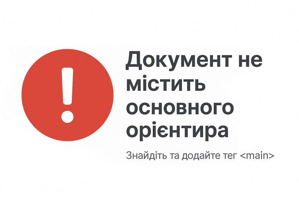 Помилка вказує на те, що на сторінці бракує основного орієнтира — елемента, який визначає, де саме розташований головний контент (стаття, опис товару, публікація тощо).