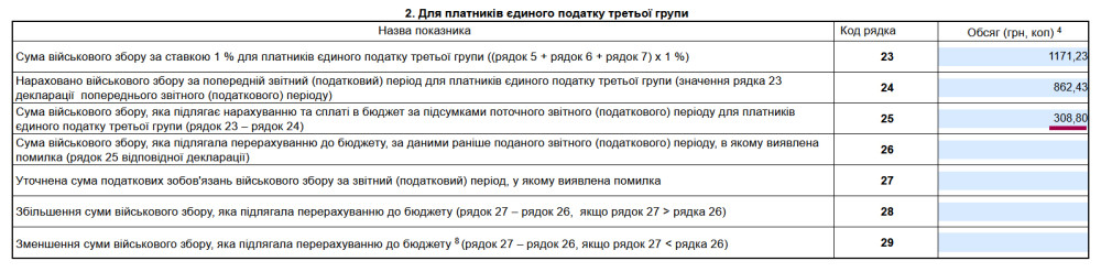 Далі — військовий збір. У розділі «VІІI. Визначення податкових зобов'язань по військовому збору» рядок 23 (1% від доходу) зазвичай заповнюється автоматично. Якщо ні — вписуємо самі.