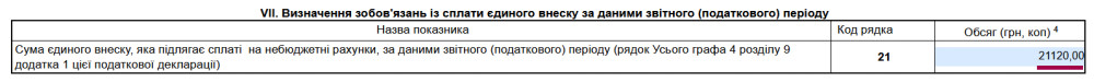 У результаті, загальна сума за весь рік по ЄСВ становитиме 21 120.00 грн, яка буде автоматично вписана у 21 рядок «Сума єдиного внеску, яка підлягає сплаті на небюджетні рахунки, за даними звітного (податкового) періоду (рядок Усього графа 4 розділу 9 додатка 1 цієї податкової декларації)» декларації: