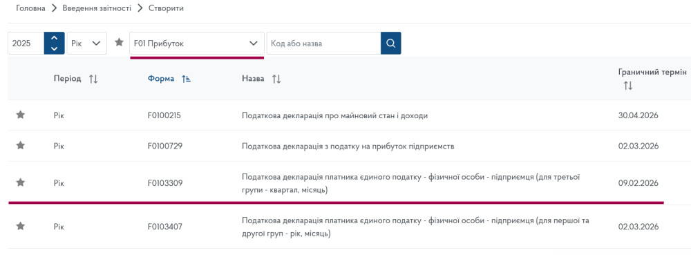 У наступному вікні вибираємо пункт «F01 Прибуток» та «F0103309 Податкова декларацiя платника єдиного податку - фiзичної особи - пiдприємця (для третьої групи - квартал, мiсяць) 09.02.2026»: