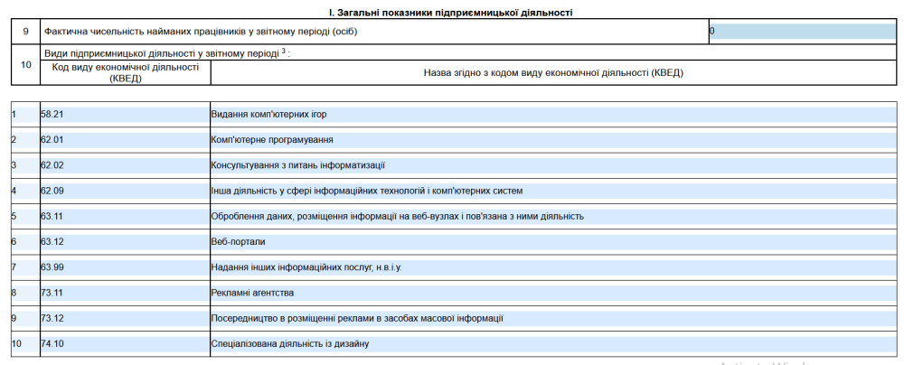 Далі переходимо до рядка 9 — «Фактична чисельність найманих працівників у звітному періоді (осіб)». Якщо працівників немає — вказуємо 0, адже ФОП сам для себе працівником не є.