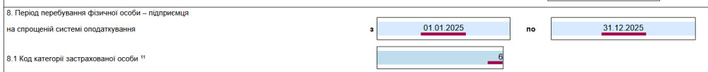 У полі 8.1 вказуємо «Код категорії застрахованої особи». Оскільки у нас спрощена система оподаткування — ставимо 6.