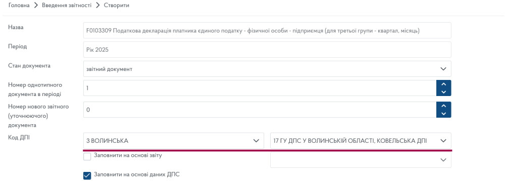 Як і раніше, звіт подаємо через Електронний кабінет платника податків — безкоштовний сервіс від податкової, який повністю забезпечує можливість коректно та зручно заповнити декларацію.В Електронному кабінеті платника переходимо до меню «Введення звітності», обираємо 2025 рік, у полі періоду подання зазначаємо «Рік» і натискаємо кнопку «Створити».