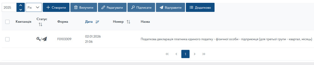 Після виконаних операцій у розділі «Введення звітності» ви побачите відправлену декларацію: