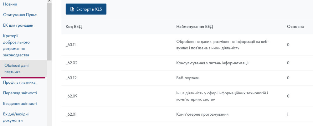 Якщо КВЕДи не заповнюються автоматично, у новому вікні переходимо до розділу «Облікові дані платника» та знаходимо потрібний код і найменування для внесення до декларації.