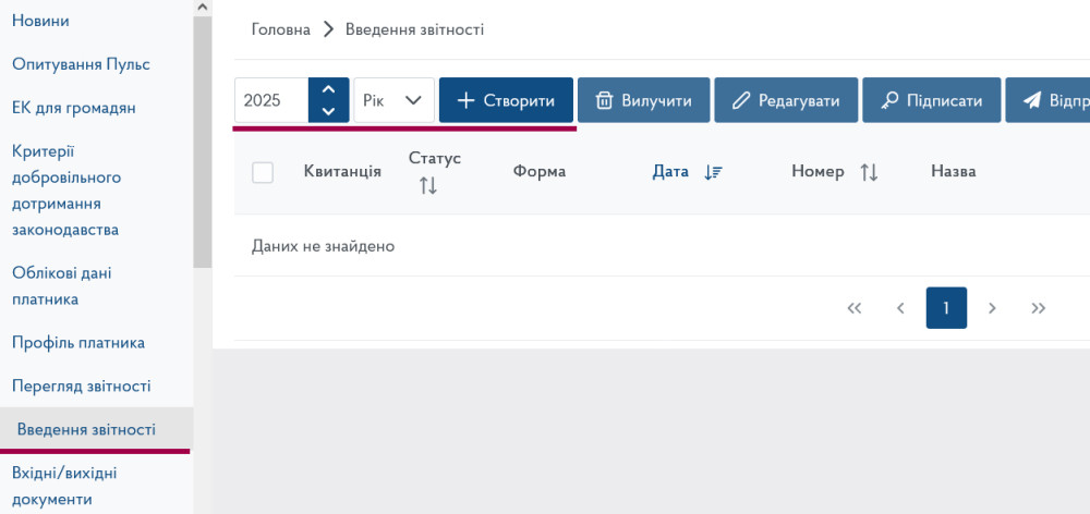 В Електронному кабінеті платника переходимо до меню «Введення звітності», обираємо 2025 рік, у полі періоду подання зазначаємо «Рік» і натискаємо кнопку «Створити».