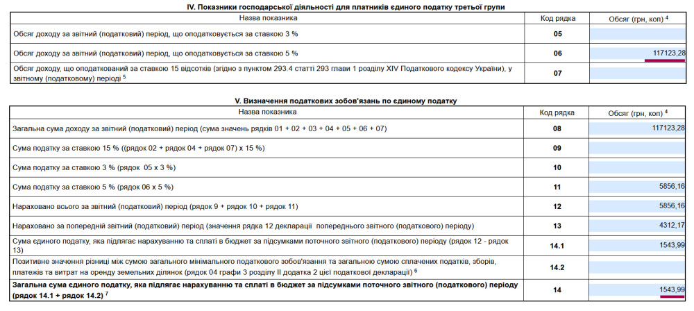 Після внесення даних у рядок 6 — «Обсяг доходу за звітний (податковий) період, що оподатковується за ставкою 5 %», усі інші необхідні рядки заповняться автоматично, виходячи з зазначеної суми доходу.