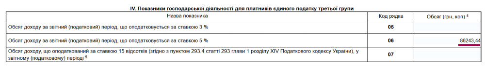 Переходимо до розділу IV — «Показники господарської діяльності для платників єдиного податку третьої групи». У рядку 6 — «Обсяг доходу за звітний (податковий) період, що оподатковується за ставкою 5 %» необхідно вказати дохід за весь рік, тобто суму доходів за I, II, III та IV квартали, а не лише за останній квартал.Примітка: ФОП третьої групи заповнюють декларацію зростаючим підсумком — по першому кварталу, півріччю, трьох кварталах та за рік.