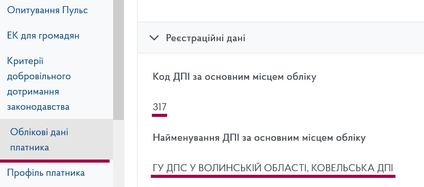 Оскільки в багатьох містах відбулася зміна податкових органів, до яких подається звітність, варто заздалегідь перевірити коректність даних. Для цього в новій вкладці браузера відкриваємо сторінку «Облікові дані платника» та звіряємо показник «Код ДПІ за основним місцем обліку».