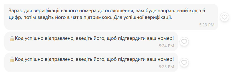 Зараз для верифікації вашого номера до оголошення вам буде направлений код з 6 цифр. Введіть його в чат з підтримкою для успішної верифікації.