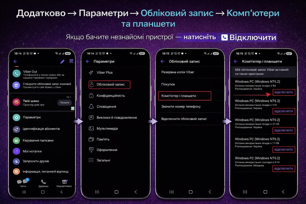 У Viber перейдіть: Додатково → Параметри → Обліковий запис → Комп’ютери та планшети. Якщо бачите незнайомі пристрої — натисніть «Відключити»