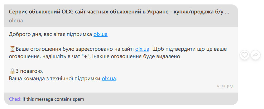 Справжня підтримка OLX не пише у Viber з вимогою підтвердження оголошення таким способом.