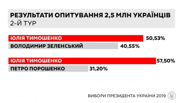 Нагадаємо, дослідження найбільших соціологічних центрів показують, що у другий тур президентських виборів проходять лідер «Батьківщини» Юлія Тимошенко та Володимир Зеленський.