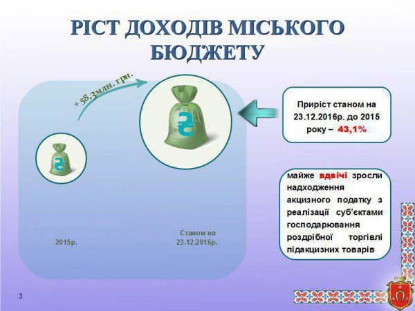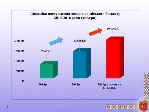 За 11 місяців 2016 року до загального фонду бюджету надійшло податків та зборів понад 185 мільйонів гривень, забезпечено виконання запланованого обсягу на 105,7 відсотка. У порівнянні з аналогічним періодом 2015 року власні надходження зросли на 61 мільйон 600 тисяч гривень, або майже на 50 відсотків.