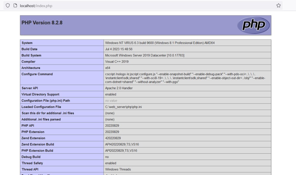 На момент оновлення статті актуальна версія PHP 8.2 (8.2.8) з назвою файлу: php-8.2.8-Win32-vs16-x64.zip. x64 Thread Safe - 64-бітний варіант для установки в якості модуля вебсервера. Розпаковуємо вміст архіву в директорію "C:\web_server\php". Як у випадку з Apache, інсталювати нічого не потрібно.