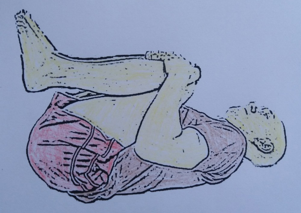 Під час вдиху опускаємо коліна. Також вправу виконуємо 20 підходів з кожним циклом по 6 секунд. Стимулює моторику товстої кишки, таким чином покращується дефекація та попереджуємо запори. Як відомо, запор є однією з причин виникнення геморою.