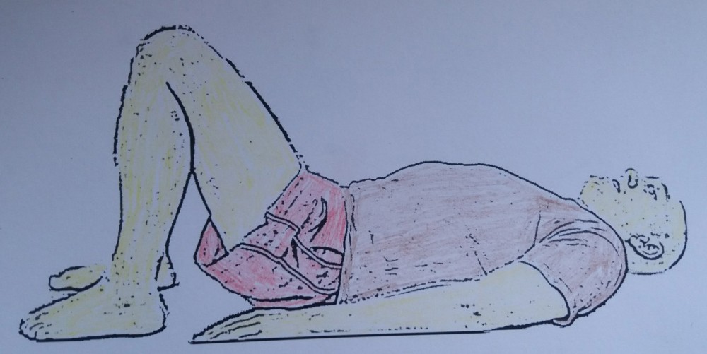 Під час видиху опускаємо тіло у вихідне положення. При цьому, коли піднімаємо таз наші груди повинні ніби впасти на підборіддя.