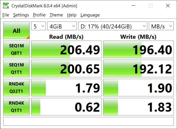 Програма CrystalDiskMark має дуже простий функціонал і лише декілька налаштувань: кількість запусків, розмір файлу та логічний диск для тестування. Чим більше запусків, тим більш правдивіший отримаємо результат. Також потрібно звернути увагу на розмір кешу, який безпосередньо стосується файлу для тестування. Якщо розмір файлу буде менший за розмір кешу жорсткого диску — тестуватиметься кеш, що не дасть правдивих результатів. Розмір файлу виставляємо в 4GB, оскільки цього більш ніж достатньо для оптимального тесту. Вибираємо локальний диск та запускаємо тестування, натиснувши кнопку All.