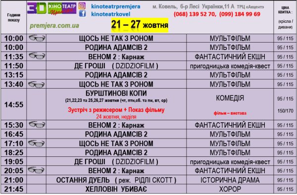 Розклад кінотеатру "Прем'єра" з 21 - 27 жовтня Цюп'яшук Руслана 21 жовтня 2021 о 15:00 🎬 Час нових вражень, приходьте до нас!🎭 Розклад з 21 - 27 жовтня 2021