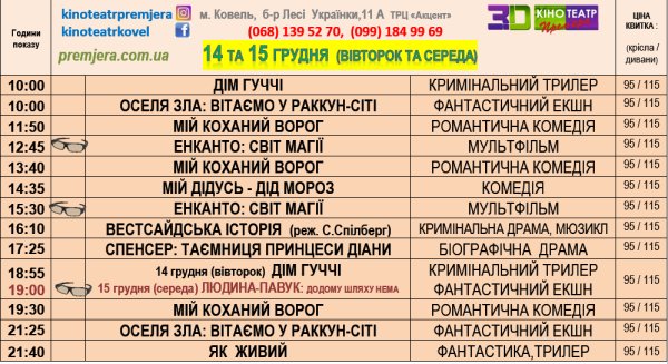 Розклад кінотеатру "Прем'єра" на 14 та 15 грудня. Зустрінемось у кінотеатрі😄